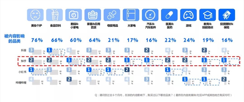 不同的内容平台,在不同的品类影响上,目前形成了自然(有意或无意)的优势。如,抖音偏重食品饮料类;知乎对数码产品、大/小家电、汽车、保险理财等品类影响较大;小红书更偏重美妆个护的影响;而B站则偏重游戏。