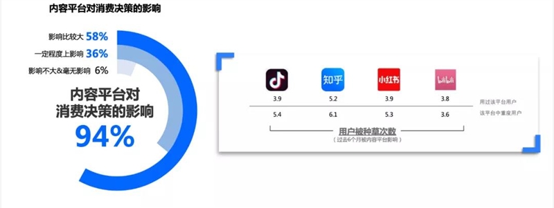 消费者在对内容平台形成自己认知的过程中,关键的第一步就是对平台上内容的感受。凯度在调研中发现,其实消费者并不反感商业化的内容,他们能接受在内容平台上被种草,但都需要建立在一个重要前提下,即内容质量要足够优质。“94%的用户认为好的内容会‘一定程度’或‘比较大’影响他们的认知,从而使他们更愿意去尝试相关产品”。