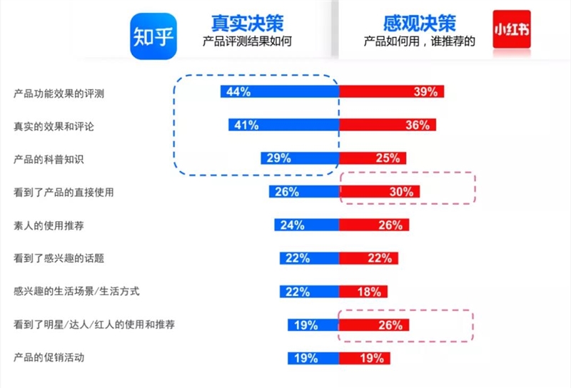 图:知乎用户偏真实决策,侧重于以评测结果或真实效果为依据, 红书用户偏体验决策,侧重于参考使用经验及人群推荐做决策。
