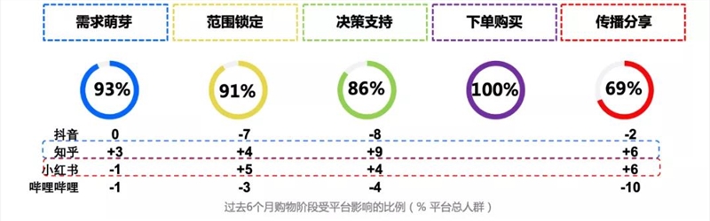 品牌方在内容营销时会发现,不同风格的内容平台之所以对消费决策有各自不同的影响作用,根本原因在于抖音、知乎、小红书、B站这些内容平台在消费全链路的五个阶段中的效果表现也各自不同。