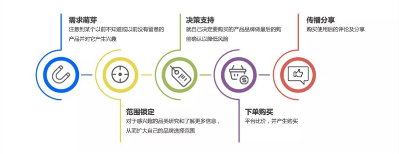凯度将消费者的消费链路分为五个主要阶段,分别是:因兴趣而对某类产品生成消费需求——萌芽阶段;在产品所属的大品类信息内容中去做了解,以便扩大并明晰界定品牌所选范围——范围锁定;随着对产品品牌的聚焦,更深入地去研究相对应的产品,做最后购买前的确认、下决策——决策支持;确定所购产品后,去多平台上比价,最终去购买——下单购买;在平台上评论、分享产品使用体验——传播分享。