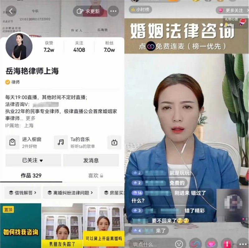 岳海艳认为抖音上婚姻法律咨询更受欢迎,“因为比较接地气,符合抖音的客户需求”,由此确定了账号定位和直播内容。
