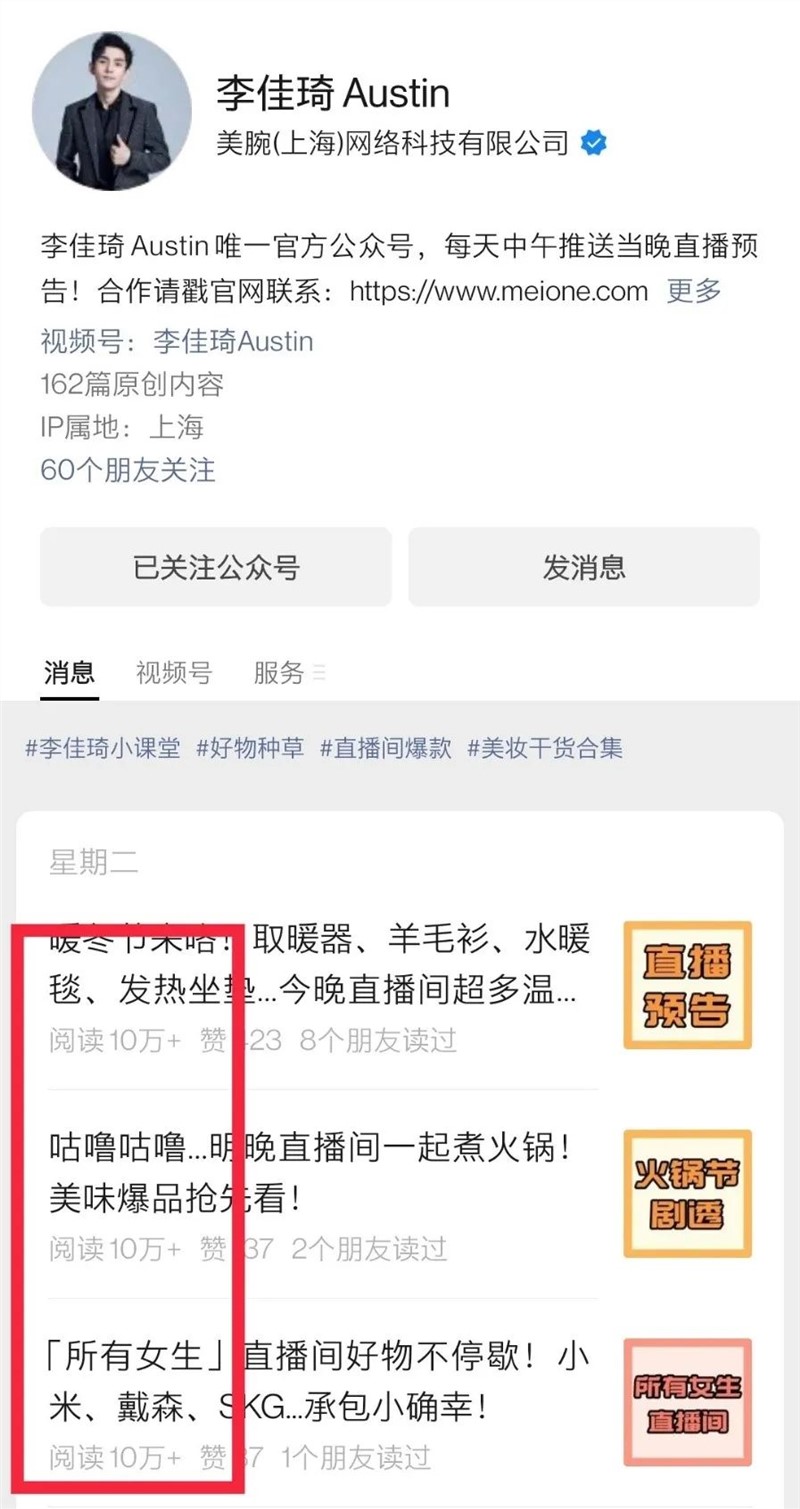 我们以公众号为例,李佳琦的微信公众号从2019年就已经开始更新,从新榜平台监测的预估数据来看,李佳琦微信公众号粉丝至少超过100万,头条阅读数几乎都是10万+,长期在霸占公众号时尚类目的TOP30。可想而知,通过私域流量运营,李佳琦在微信渠道已经积累下至少100万的粉丝群体。