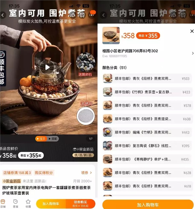 浏览相关商品,会发现不少单品的月销售量达到一两千件,其中一价格355元起的围炉煮茶套装,月销售额超过2000件,粗略估计销售额近百万元。