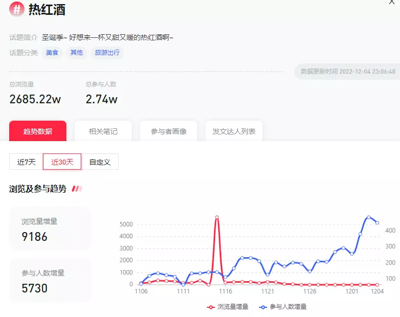 到今年,热红酒并没有就此成为过气网红。新红数据显示,#热红酒#话题的总浏览量超过2685万次,进入12月份之后,分享相关内容的人数更是持续走高。