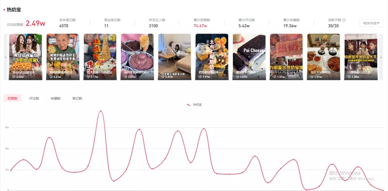 在抖音上,#热奶宝#的话题播放量近8亿次;新红数据显示,在小红书上,近一个月有4570条热奶宝为主题的笔记,累计获赞数达到75万,平均每条笔记获赞2.5万次。