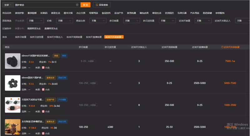 在抖音上,围炉煮茶的“装备”也很受热捧。从新抖数据来看,近一个月炭火、茶壶等商品销量持续走高,炭片月销量达到5000-1万,茶壶等月销量也达到1000-2500个。