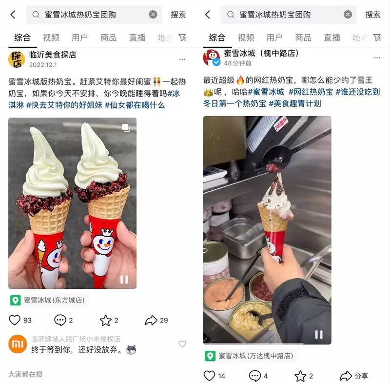 线下的品牌和商家也趁势推出了单品或是套餐服务。比如蜜雪冰城就给出了“热奶宝”搭配方案,只是奶油被换成了货真价实的冰淇淋。