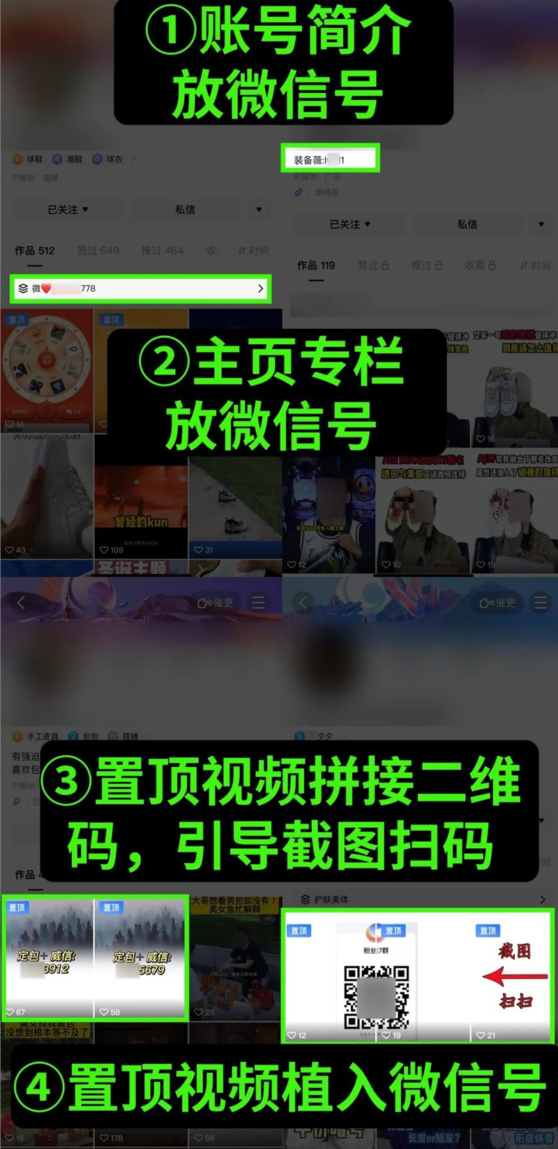 可用4种方式导入微信私域:1、主页专栏放微信号;2、账号简介放微信号;3、置顶视频植入微信号;4、置顶视频拼接二维码,引导截图扫码。