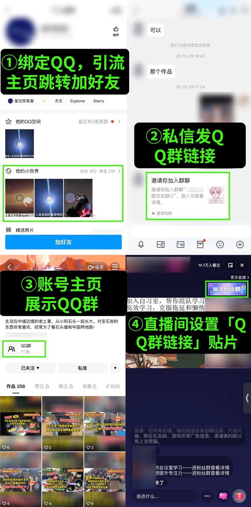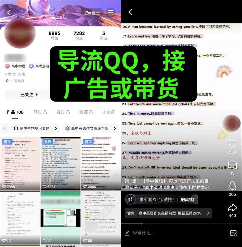小世界打通了QQ私域,可跳转衔接个人QQ、QQ群、QQ空间及QQ小店。例如:账号@x料库,粉丝0.7W,每日1更,发高中学科资料、学霸逆袭笔记、考试资料等内容。将资料图片混剪成轮播视频,吸引高中生粉丝在评论区咨询,私信引导加好友进QQ空间自取。