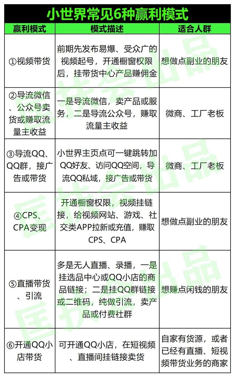 言归正传,普通人和商家如何在小世界上赚钱?废话不多说,6种玩法,一张图表示!