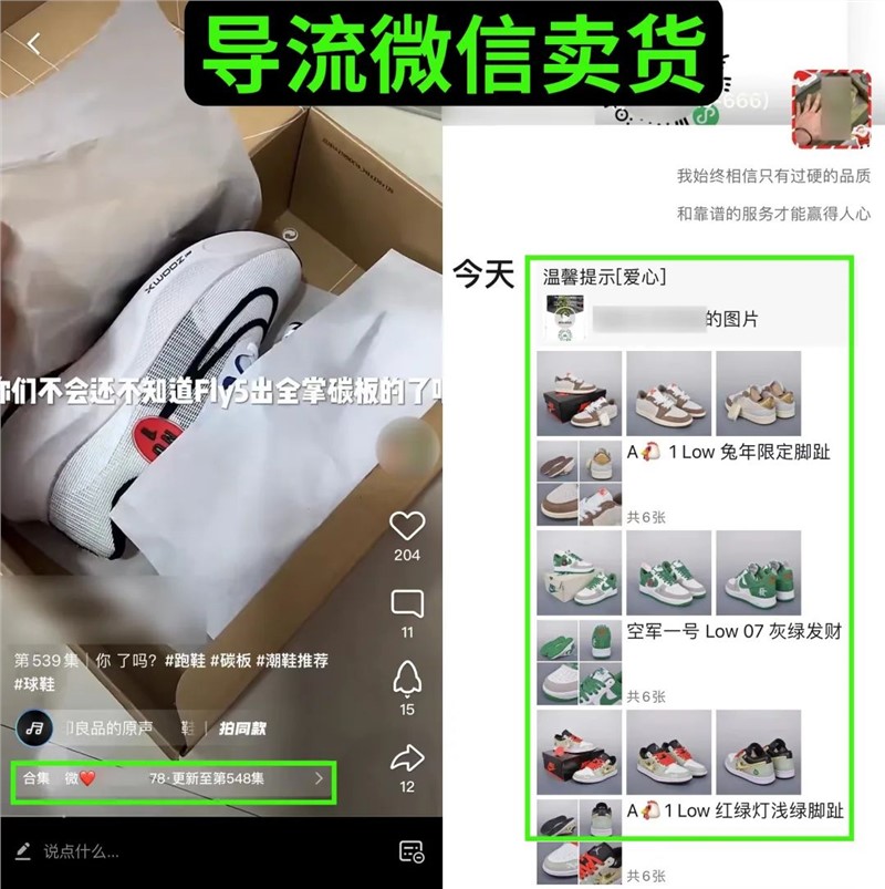 一是导流微信,卖产品或服务,二是导流公众号,赚取流量主收益。例如:账号@鞋x无印良品,粉丝1.6W,每日1-3更,发布球鞋开箱、球鞋搭配、球鞋手绘、球星赛事、打球段子等“二创内容”,在视频合集名称留微信,制定视频留二维码,引导客户加V购买,主要销售复刻球鞋、潮服、NBA球衣。