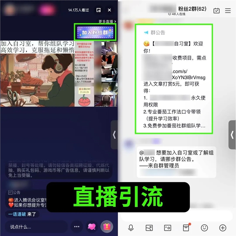 二是直播间挂QQ群链接或二维码,纯做引流,卖产品或付费社群。例如:账号@X安自习室,直播播放线上自习室,引导有学习需求的学生及考公、考研、考证党,点击“QQ群链接”直播贴片,进入社群,付费成为会员后可连麦直播间进行“在线自习”。