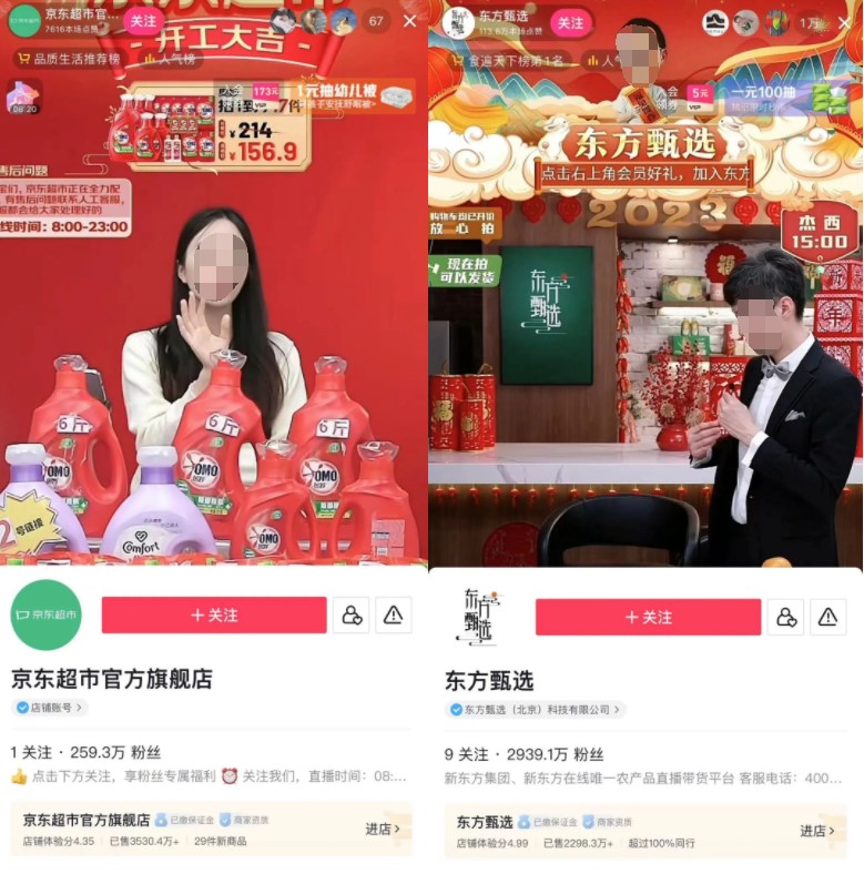 抖音的流量已经吸引同行到这里寻找流量。京东超市就是其一,京东超市官方旗舰店在抖音拥有259.3万粉丝,京东超市在京东直播的粉丝量则为34.6万。