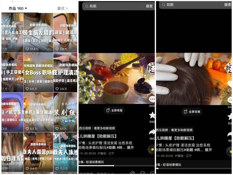 化妆刷划过面颊的沙沙声,沉下泳池时清晰的气泡声,头皮被按摩时的簌簌声……对相当一部分用户而言都是十足的解压神器。并且,丰富的情景设置,还打破了普通asmr视频的沉闷感,额外带给粉丝一种体验服务的仪式感。