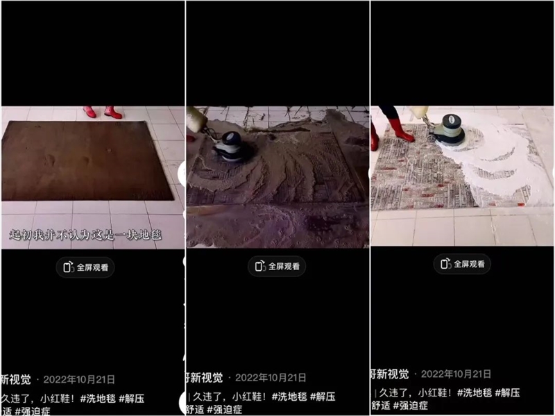 洗地毯视频的开场,一般都是向用户展现一块脏的不见原貌的“黑色地毯”,然后经过冲水、洗涤剂、翻面、刮水等等动作使其“重现真容”,过脏的地毯还会重复上述过程三到四次。一套流程下来,视频的时间可以说是意料之中的长,有的甚至能突破10分钟,但向来“急躁”的短视频观众们,对它的容忍度却异常的高。