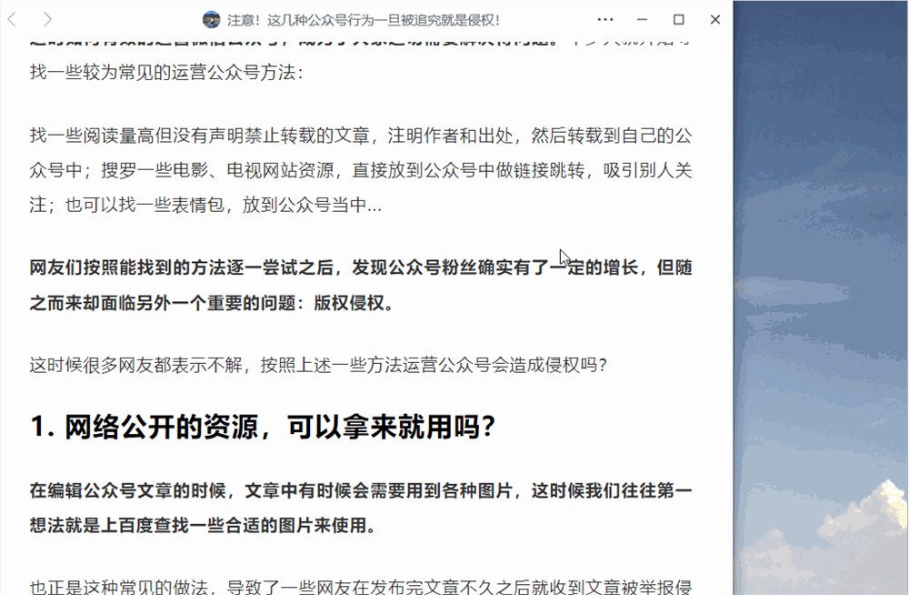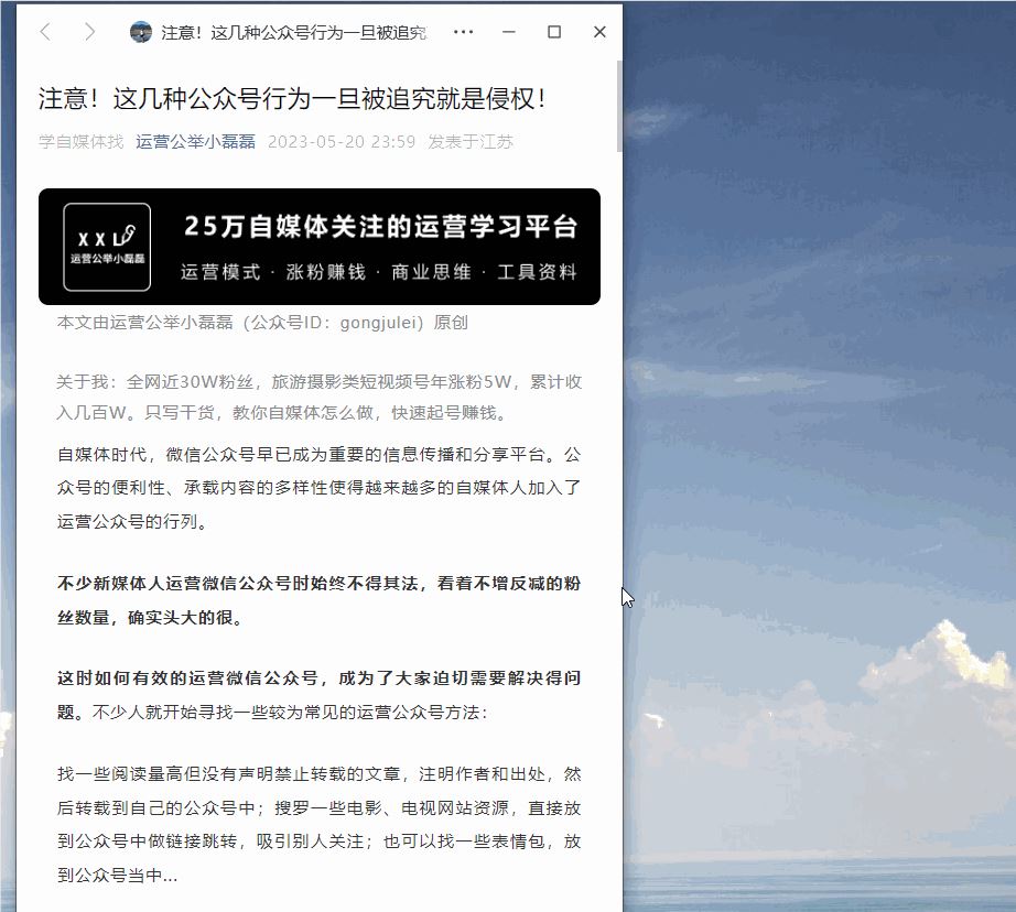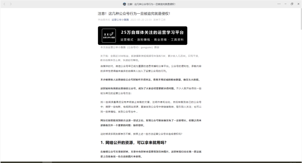 在PC端打开任意一篇微信文章,出现弹窗,顶部会显示公众号LOGO和文章标题,不过要注意的是LOGO是无法点击的。