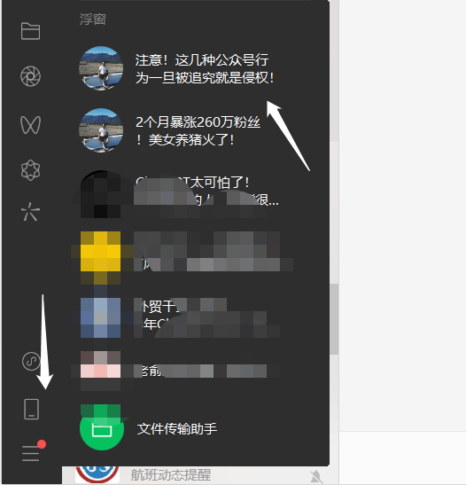 点击“添加浮窗”会缩小至客户端左下角的“手机”功能栏中,电脑屏幕中就不会显示该文章,想要再次阅读点击即可,会自动展开到屏幕上。