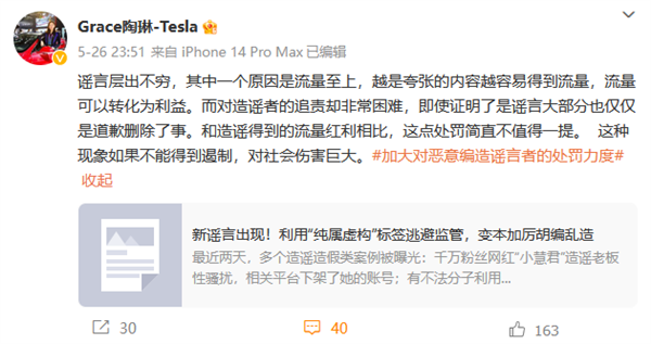 特斯拉陶琳:谣言层出不穷、原因之一是流量至上