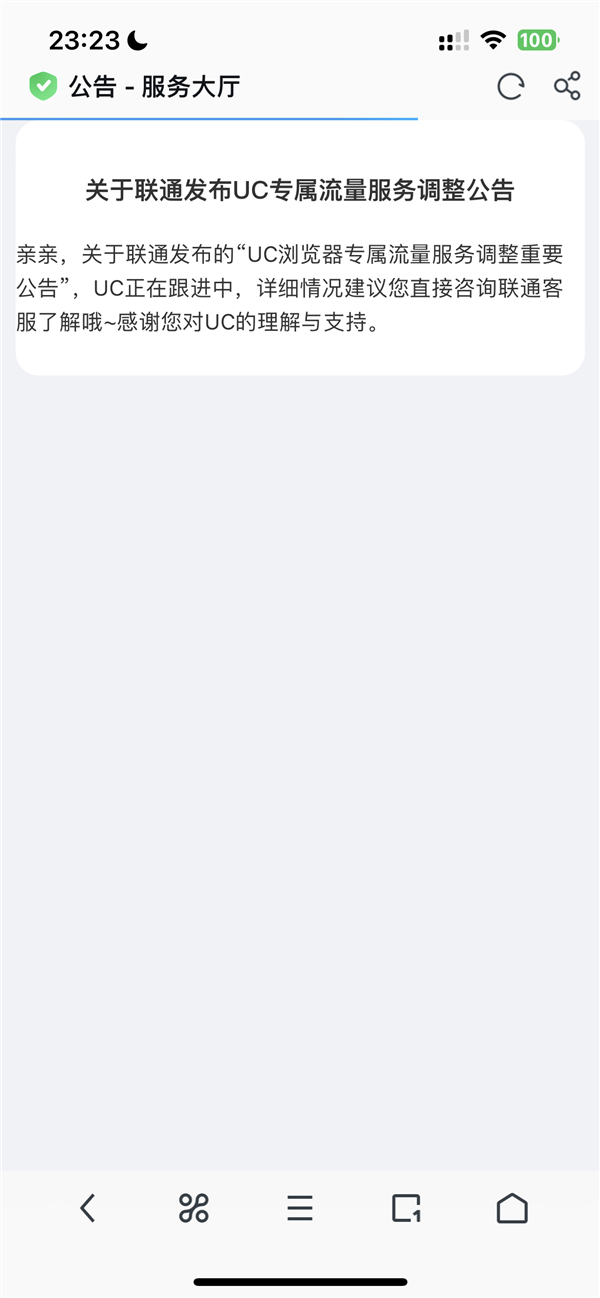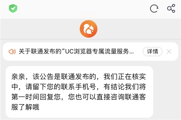 UC浏览器在公告中称,关于联通发布的UC浏览器专属流量服务调整重要公告”,UC正在跟进中,详细情况建议用户直接咨询联通客服了解。