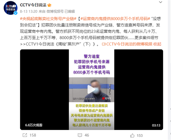 根据CCTV今日说法官微,在8月13日的《揭秘黑灰产”》节目中,曾提到公安机关抓获不同岗位的23名运营商内鬼,每人获利从几十万、上百万至上千万不等。