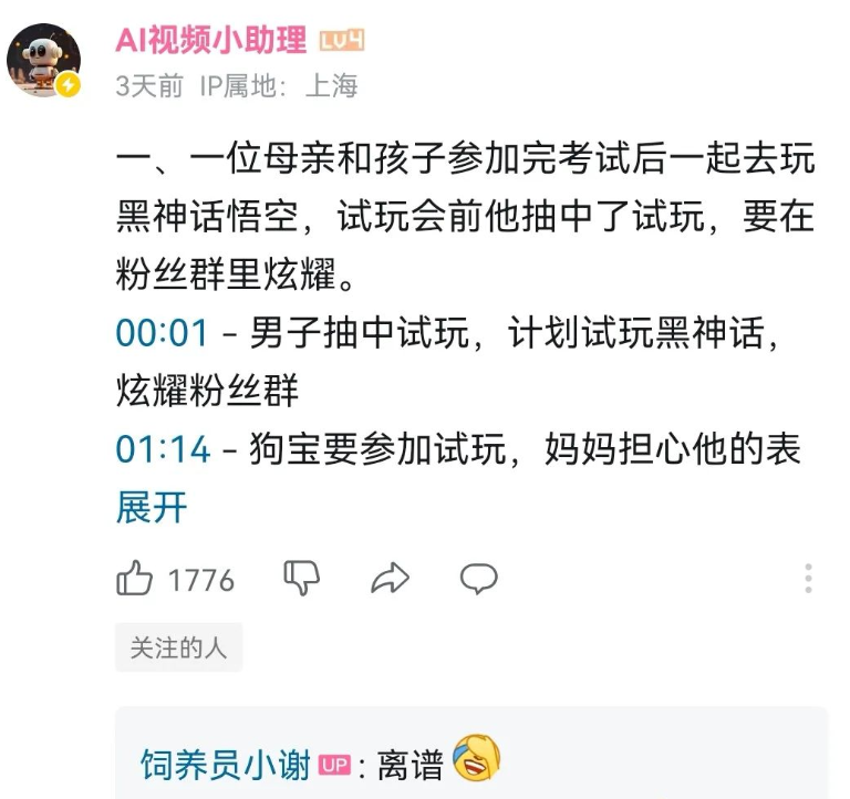 比如UP主“饲养员小谢”和老公一起参加了游戏《黑神话:悟空》的线下试玩会,感觉就像妈妈送孩子去考试,所以视频中两人以母子相称打趣,“AI视频小助理”却在总结时当真了,UP主见了直呼“离谱”。