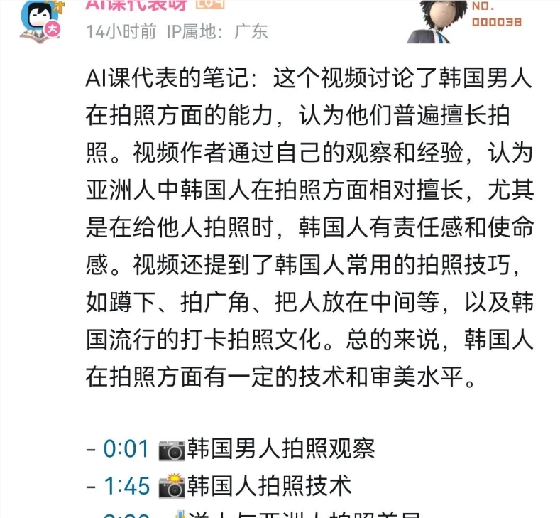 这与平台的不同特点有关。首先视频比图文承载的信息更丰富,小红书的笔记以短图文为主,本身就是压缩、精简过的信息了,而抖音、快手上又大多是1分钟以内的短视频,省流作用不大,观众有召唤AI再看总结的时间不如直接看完视频。相比之下,B站大量的中长视频催生出了“课代表”的社区文化。