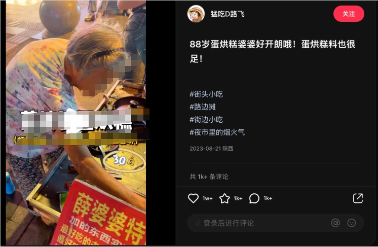 这篇笔记点赞超过1万,主题是一位老奶奶在街边做的蛋烘糕小吃,年纪很大但依然在劳动,本身就话题满满,再加上路边小吃的属性,主题算是符合爆文的基本条件了,额外又通过了视频的呈现形式,展现了老奶奶在食物之外的一些个人特色,如果笔记不遇到特殊的问题(比如误判违规限流等),那么成为爆文的概率是非常高的。